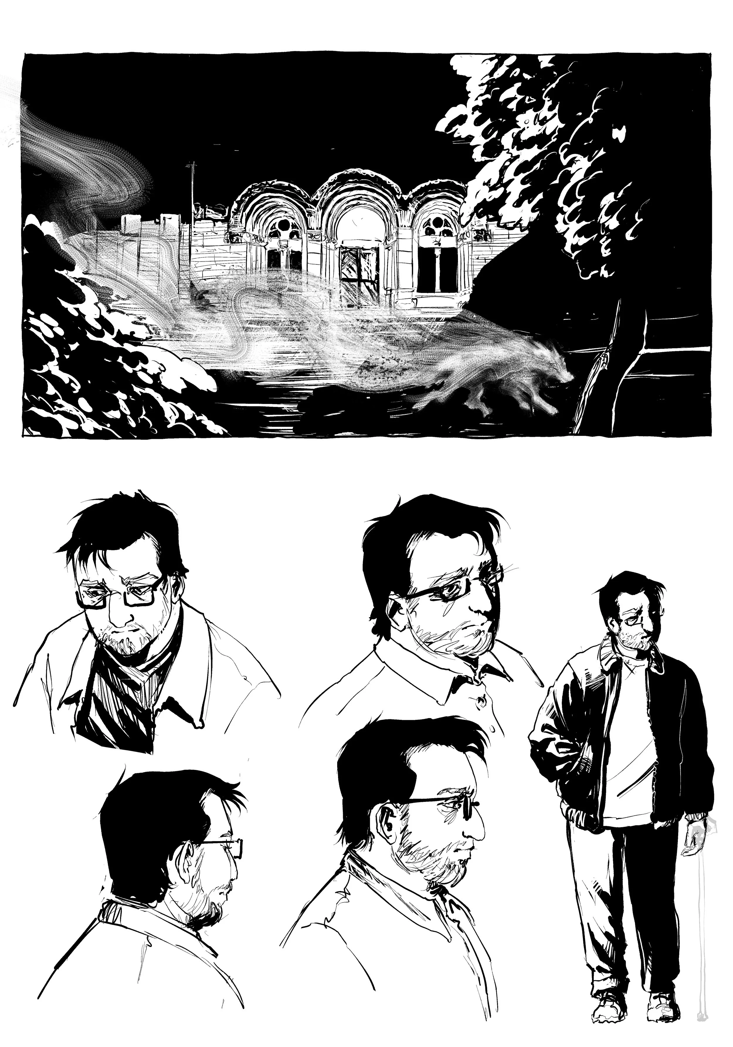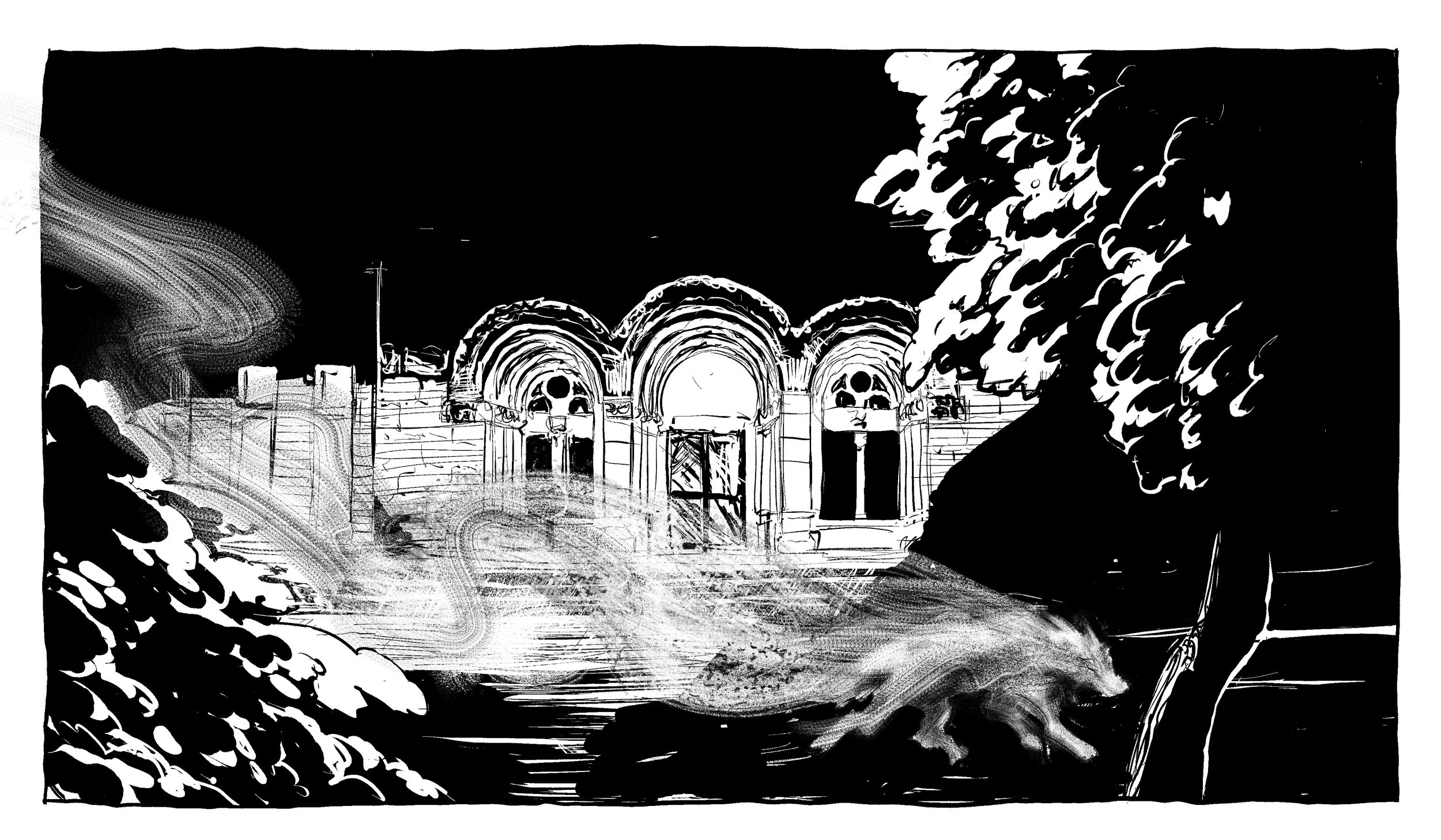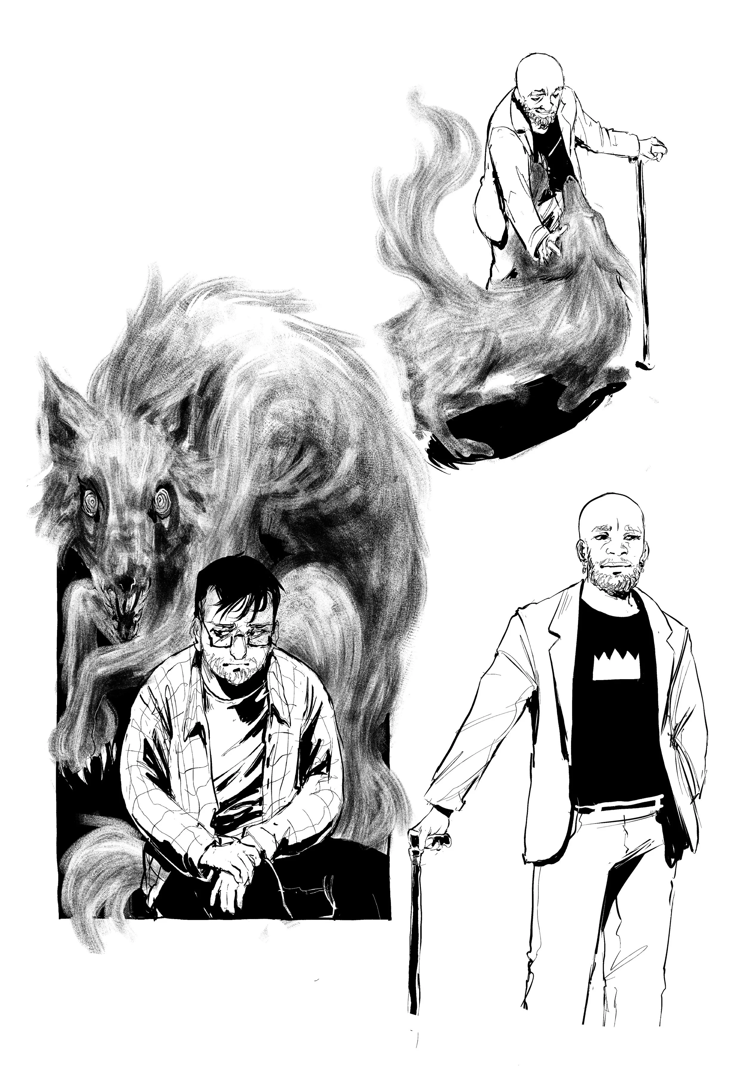 Michael is naturally drawn to working in black and white, and the moody tone he sees in the Bisclavret’s palpable distress lends itself well to ink brush visuals. He decided to portray Bisclavret’s lupine form with a textured dry brush to give it an otherworldly appearance, emphasizing his “otherness,” taking inspiration from horror art (go see hisotherwork, it’s stunning).