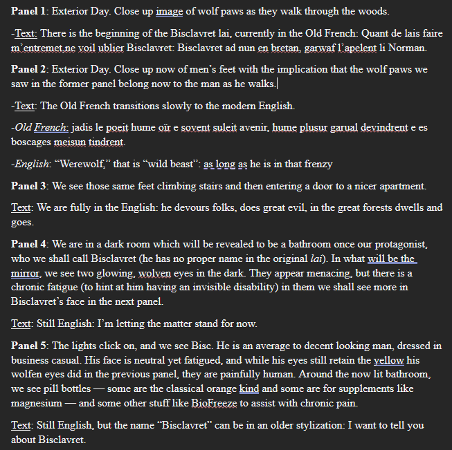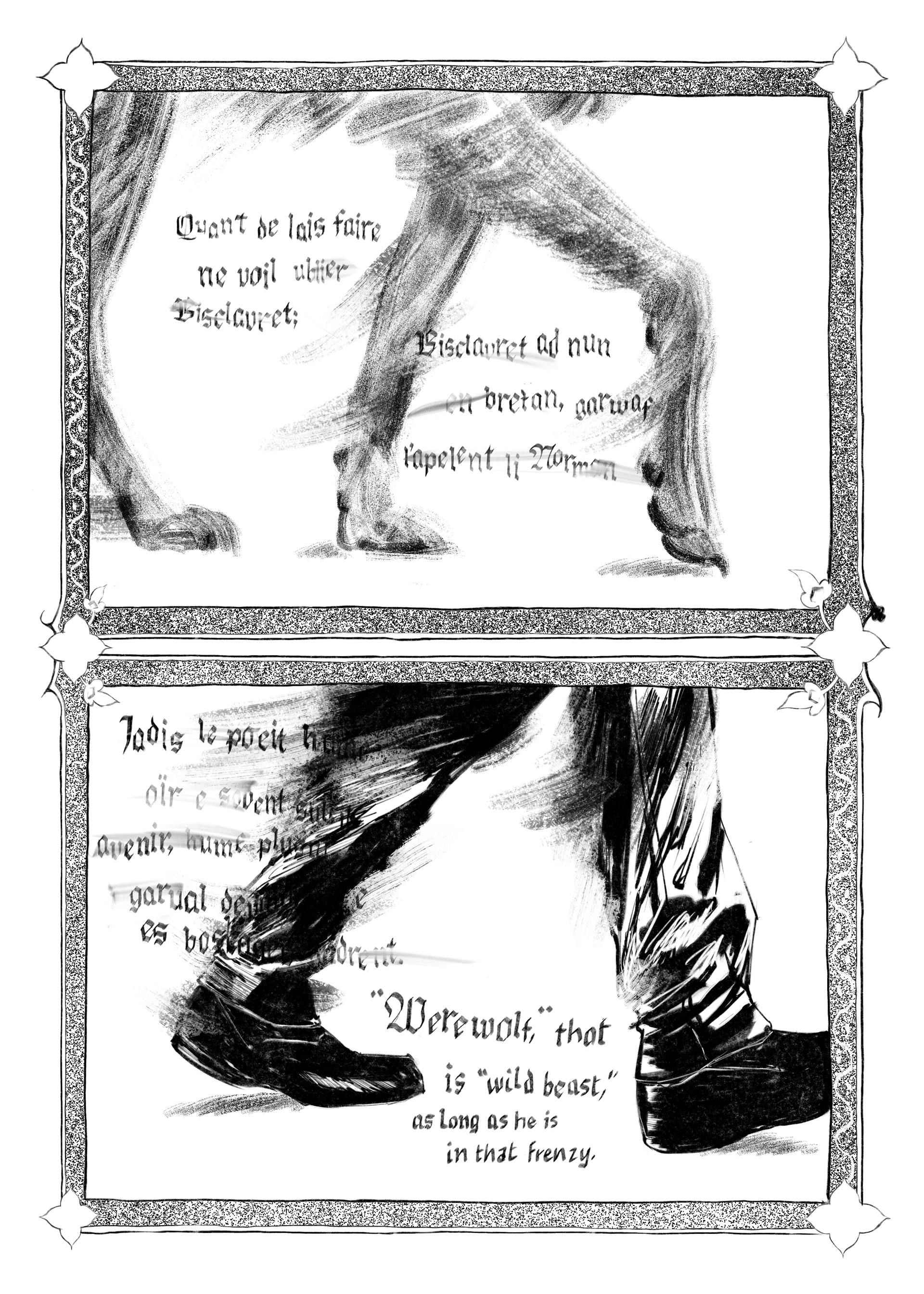 While my research mainly focuses on sexual violence within late medieval literature — not a cheery topic, but a necessary one — I find a lot of comfort in finding ways we can learn about different areas of disability studies from various monster tales. With Bisclavret, I love thinking about how we can read it as a healthy model of listening to narratives of sickness or disability. Though I’ve presented these ideas in conference papers and hopefully in a future publication, I would also like to share them with the world beyond academia, a task for which comics seem particularly well suited. But how do I, someone whose artistic abilities start and end with stick figures, make these ideas approachable and appealing?