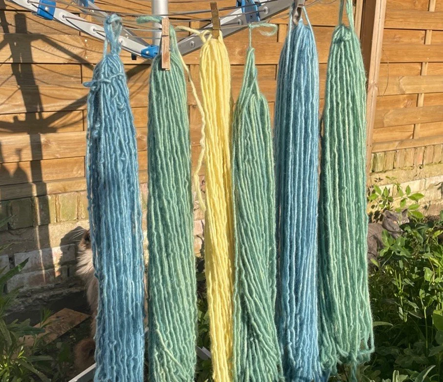 Dyed wool hanging up to dry: blue (woad), forest green (weld overdyed with woad) and yellow (weld)