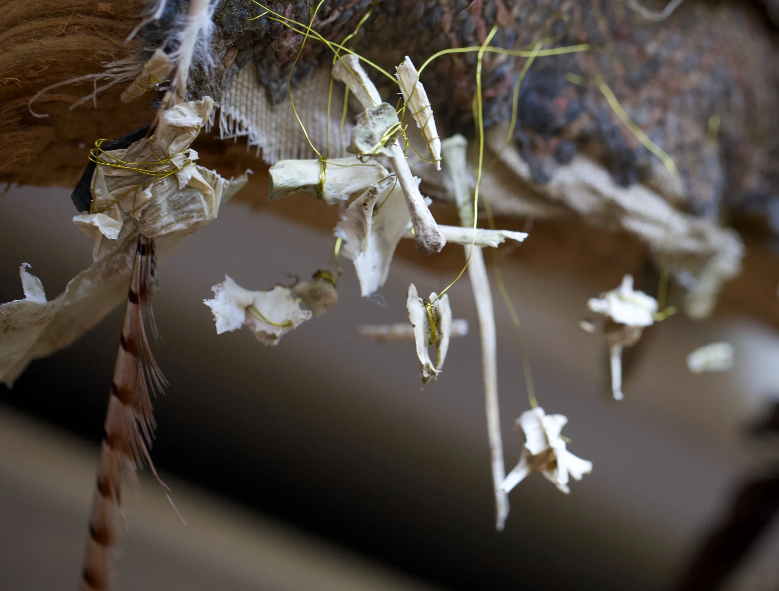 Ritual object made with waste fabric, bones, feathers, plastic etc recovered from landfill. (‘Hodening’ from Wastelands).