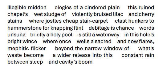 It’s hard to share short extracts from Wastelands as so much depends on the way the text is patterned and placed across the page but here are two edited fragments from ‘Dog Pilgrim’ which I hope give some sense of the work. The first is a glimpse at the jumbled ‘archaeology’ of a landfill site situated on top of a much older and once sacred landscape: